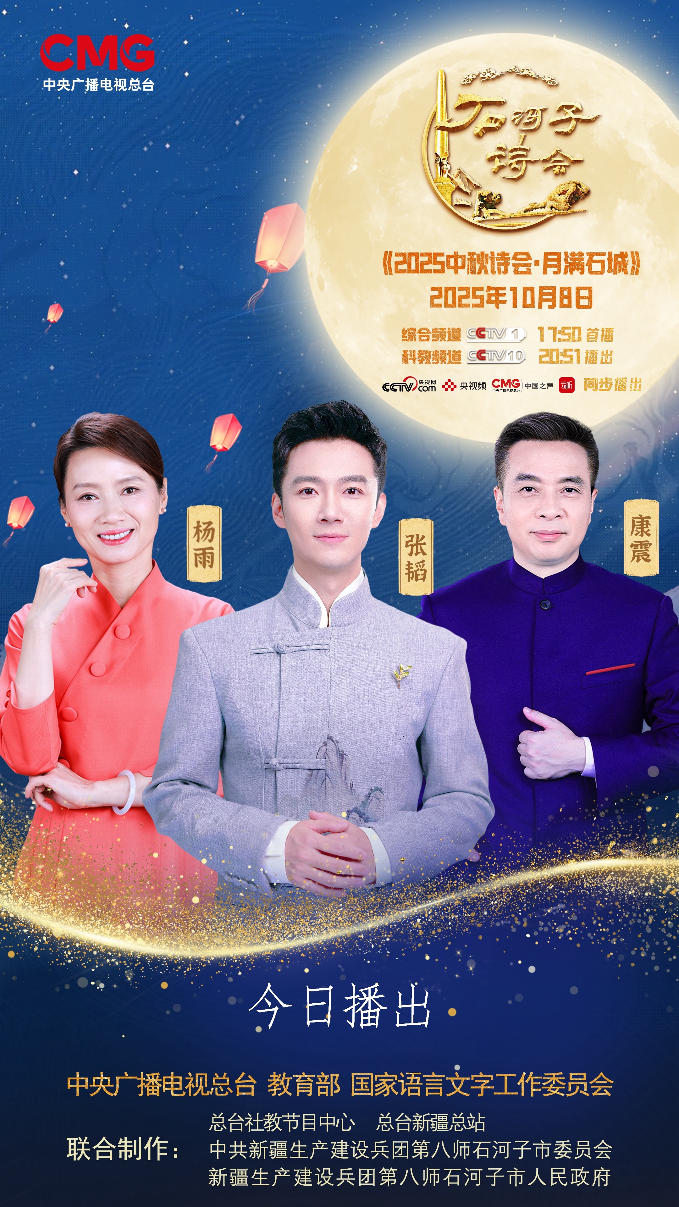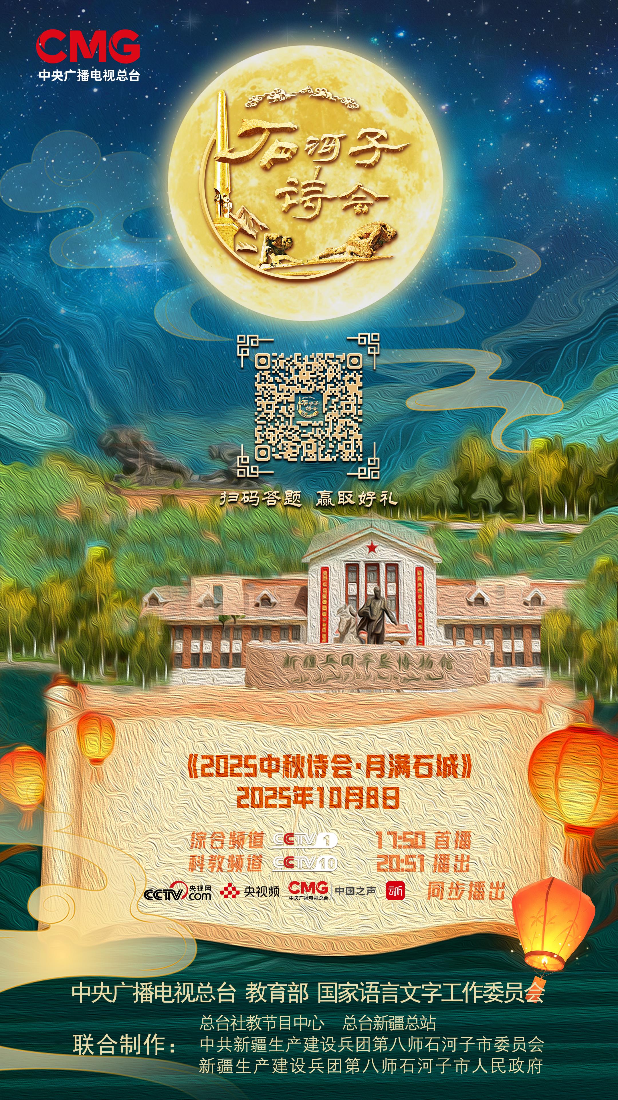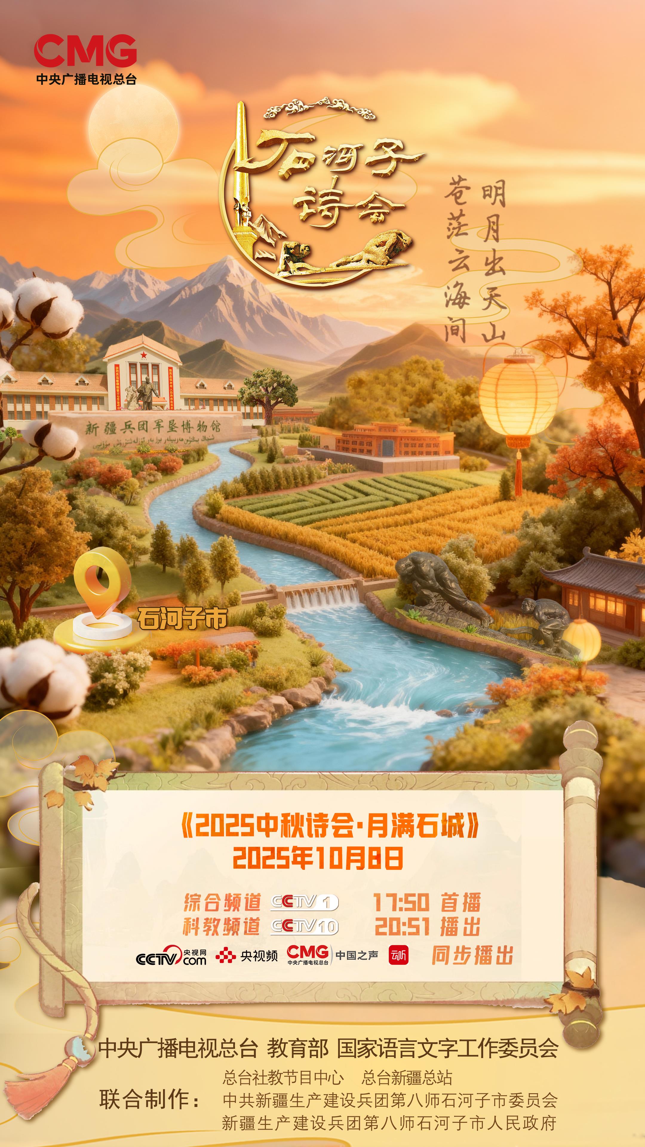 中秋的明月照过古人,也将照亮今人的路;石河子的诗行写尽过往,也将书写未来。《2025中秋诗会·石河子诗会》通过主题化策划铸魂、时代化赋能增效、群众化传播润心,将“古来青史谁不见,今见功名胜古人”的豪情壮志融入每一个篇章,让全国观众看见新疆的生态之美、文化之韵、发展之兴,更让兵团精神与诗词文化在新时代继续焕发荣光。10月8日17:50,锁定CCTV-1,共赴这场“明月与诗行齐辉,家国与团圆同庆”的文化之约,共同见证“戈壁明珠”石河子在千年诗韵的滋养下绽放出的夺目光彩。