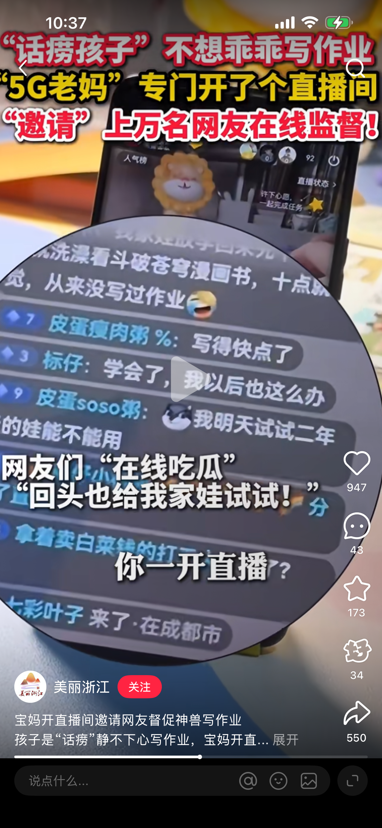 有家长让娃直播写作业,效果不错 截图来自美丽浙江